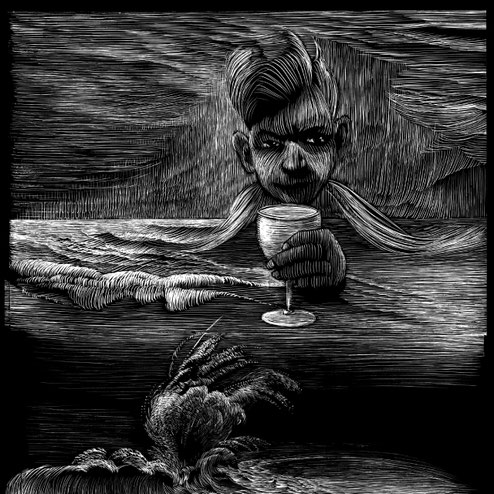 Bild: © Ausschnitt aus: Hannes Binder: Sommer in Nervi, Orchideenkopf mit Weinglas, Schabkarton, 21 x 29,7 cm, aus Hannes Binder: Glauser in Nervi, Limmat Verlag 2025